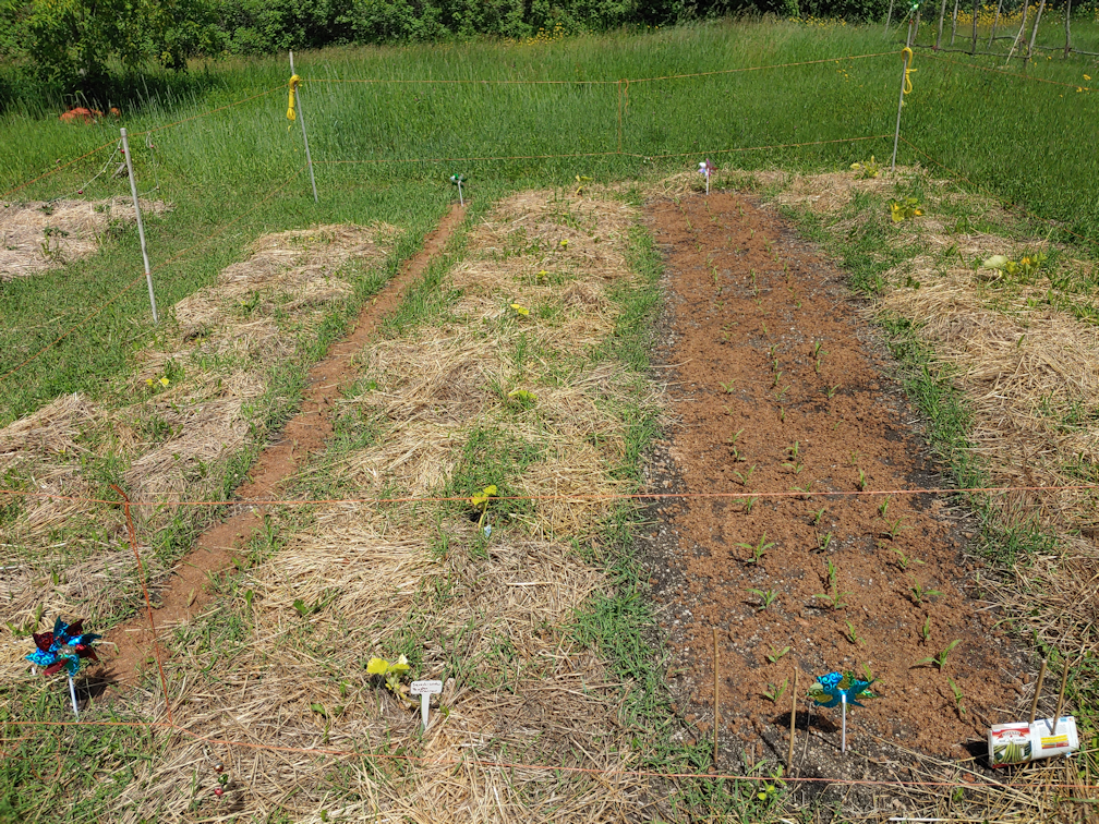 In the bed on the far left, with the Indigo Blue Chocolate tomatoes, I sowed all the Gold Ball turnips in one half, and Merlin beets in the other. These were densely planted in many short rows, more Square Foot Gardening style. When we planted the Gold Ball turnips last year, something ate them pretty much as soon as they germinated. I’m hoping surrounding them with onions will help keep away whatever ate them – I never saw any hint of what it was. I had intended to put a floating row cover over the turnips to protect them, but the space is too narrow for that.