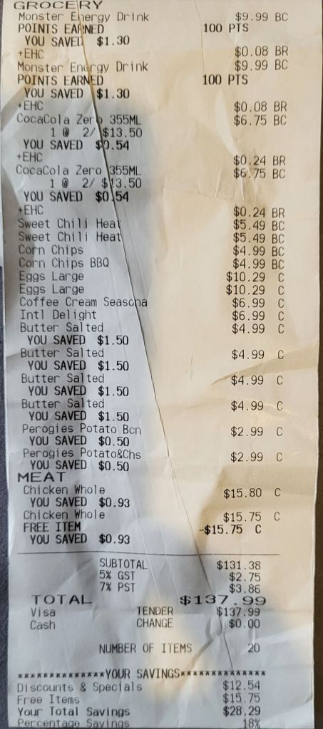 My daughter had requested the energy drinks and coffee creamer. The cases of energy drinks were quite a bit cheaper than most of their sales, so I got two. Usually, it’s just maybe 50¢ off per case, but this time they were $1.30 off per case.