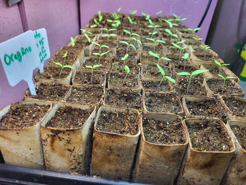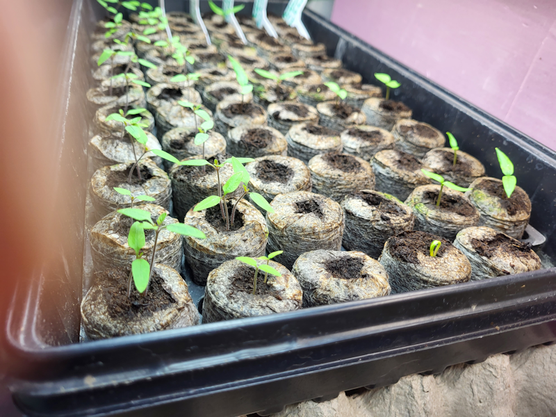 I had to moisten more seed starter mix for this job, and I made sure to use hot water for that. By the time the cells were filled and the seeds were being transferred out of their trays, the damp mix was still warm. Warmer than the damp paper towels the seeds were on. Now they’re in the tray along with the Turkish Orange eggplant (there’s 6 visible seedlings there), the luffa (all three have finally emerged) and sweet bell pepper mix (no sign of any of those, yet). The bottom of the tray got warm water, too – I wanted to make sure those square peat pots had plenty of moisture to absorb, so they don’t try out the seed starting mix.