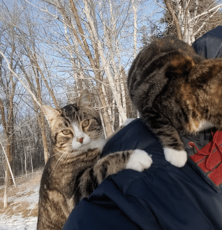 They just wanted to keep their paws warm. Butterscotch didn’t even growl and hiss at Potato Beetle when he jumped up my back!