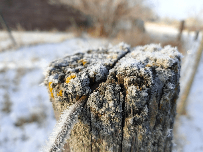 Even the ugly wires used for fencing looked beautiful. I love how the lichen on this fence post looks, all frosted up!