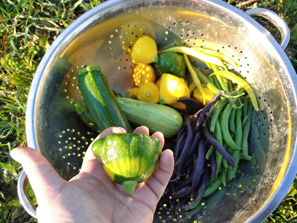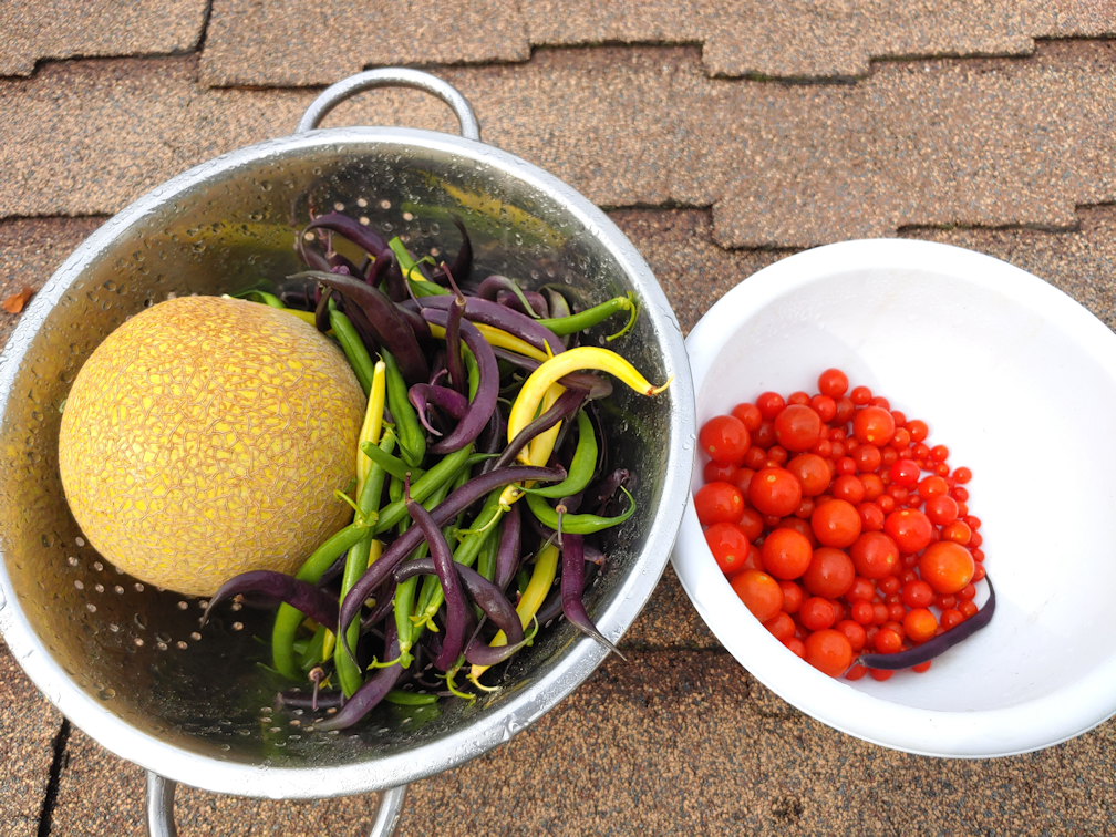 When I got to the bed with the ripening Sub Arctic Plenty tomatoes, I decided to go ahead and harvest them. They’re a touch on the green side, but they will continue to ripen inside. I also grabbed the few bush beans that were available to gather.