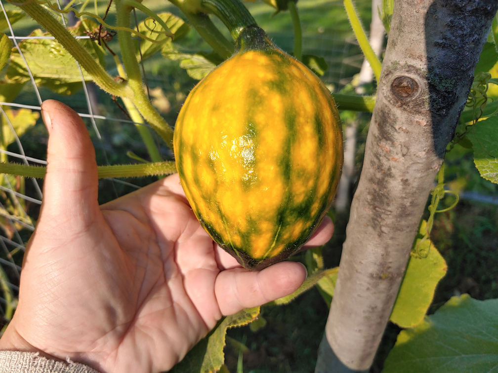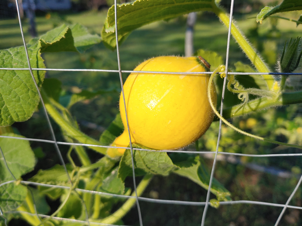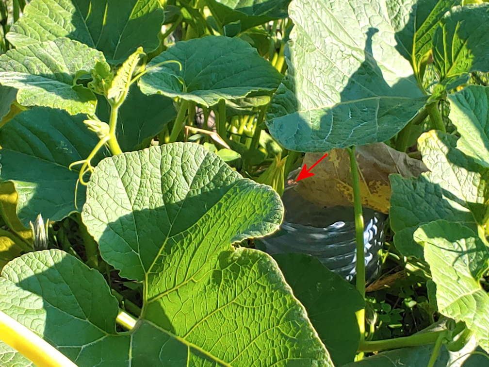The next photo is of the one developing pumpkin that I hand pollinated; there’s another on that vine, but its flower has now opened yet. I’ve added support to the vine itself, to take some of the weight off the plastic trellis netting, but the pumpkin has already gotten heavier enough to start pulling down on it again. We will construct a sling for it soon. The vine can handle the weight. The temporary plastic trellis netting cannot.