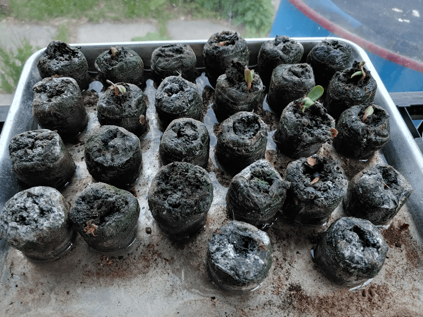 That made me curious enough to look at the rest of the pellets. I haven’t been watering the tray they were in, but when I lifted some of them up, I saw roots! No sprouts, just roots.
