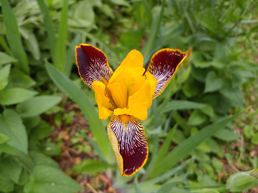 When we were preparing the bed next to the retaining wall, there was a compact plant growing in it. Unsure of what it was, other than “some kind of flower”, we dug it up and transplanted it between the rhubarb and the chives. It quickly grew from a compact, bushy plant to the tall, leggy thing you can see in the photo.