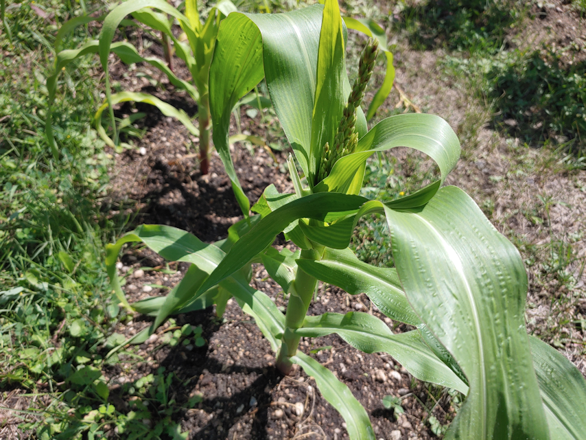 The corn is nowhere near as tall as they would have been, if we weren’t in drought conditions, but they have really grown a lot in a very short time, and are starting to develop their tassels. Because of how long the area of corn and sunflowers is, the sprinkler we have can’t cover it all. To be able to water it all, we set it up in the middle of one of the sunflower blocks, set it to “full”, and it can water most of the blocks. After a while, we move it to the end and set it to spray just on one side, and we get the rest of it. The corn block in the middle tends to get water from both settings, and it really shows. The corn in the photo in that middle block.