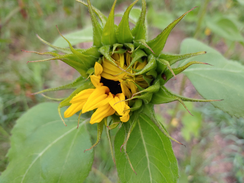 This is another Hopi Black Dye sunflower, from the row of transplants. These are the ones that did not germinate until after the others were direct sown, so they were much smaller and further behind. Then they had their tops chomped off by deer. Yet here they are, spindly and barely knee high, yet the seed heads are starting to open before the big ones!!