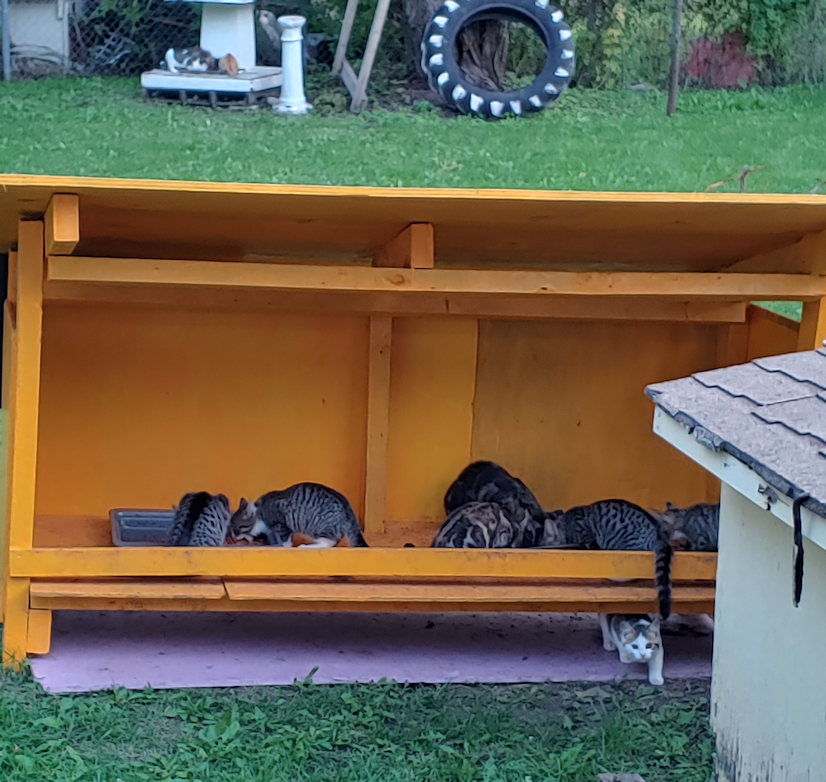 All three litters of kittens were running all over the yard, playing with each other! The fact that most of them stayed to eat while I took photos – even with zoom – is very encouraging. :-) It will be good for them to get used to each other, since we can expect them all to be using the cat shelter over the winter.