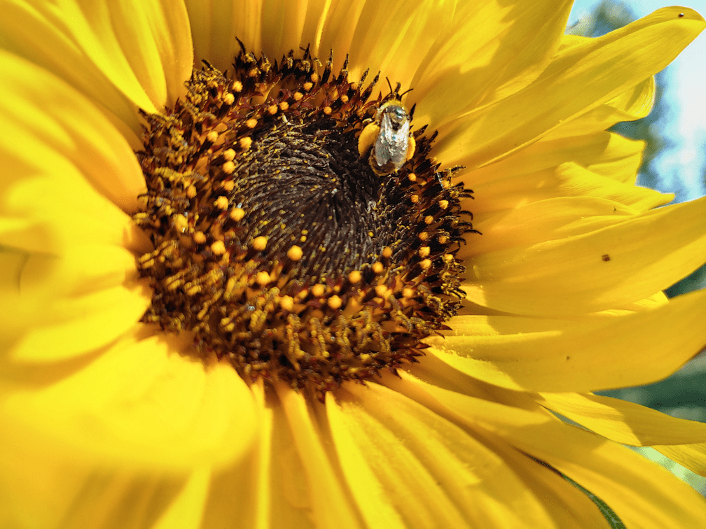 A lovely little bee, laden with golden pollen, on a Hopi Black Dye sunflower!