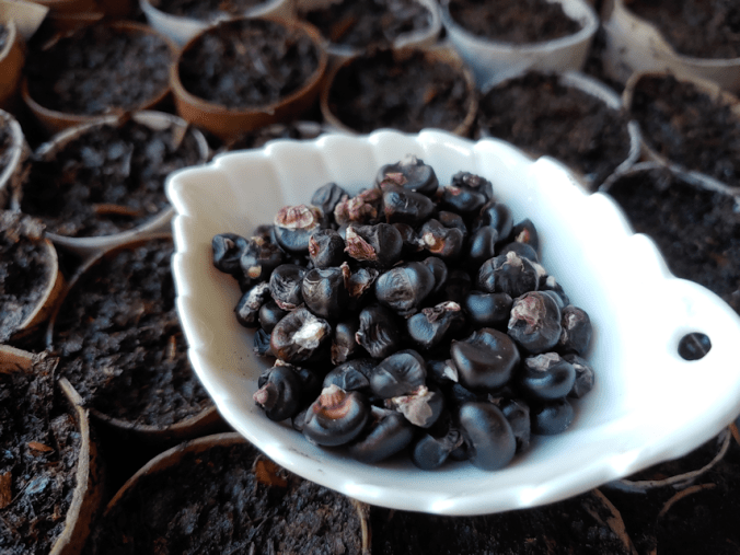 These were not there when I checked them this morning, but both the yellow and green bean beds had sprouts, some still carrying their brightly coloured inoculated seed covering. The Royal Burgundy didn’t have any sprouts, but when I came back later to water them, even that bed had sprouts just starting to break through the soil. I’m so excited!!!