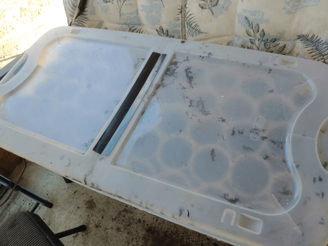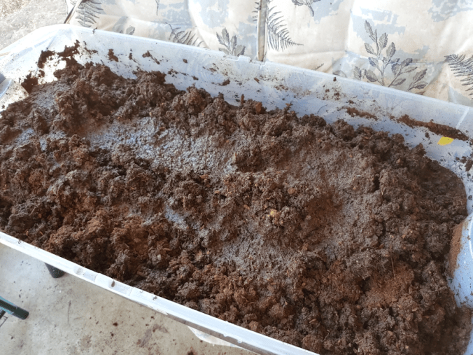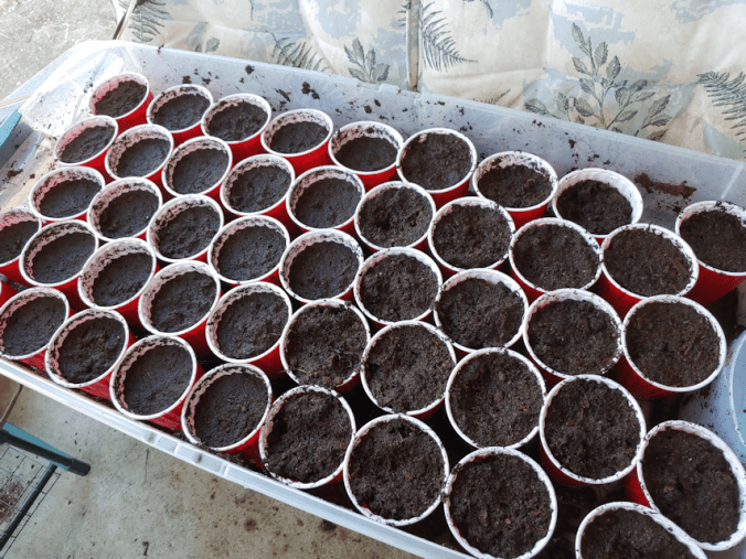 This is with the inner door open, the screen window in the outer door open as wide as it can, and the ceiling fan going at its highest setting, and it still got to about 37-38C/99-100F. There are still a few trays of seedlings (and cups of dirt I’m pretending to expect things to germinate, still) in the sun room while I take the rest out to harden off. The trays outside got misted several times during the day, but a bunch of the squash and melons were really droopy by the end of the day. For all the misting they got, they still dried out quite a bit, so everything got a thorough watering before they came in for the night. Except the corn. They get put back into their bin, without the outer cups, so I put water in the bin for them to absorb from below.