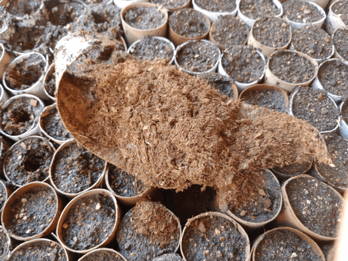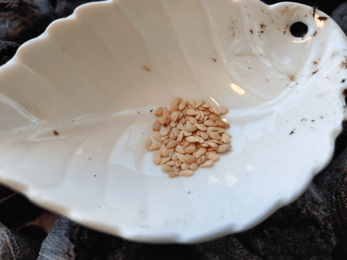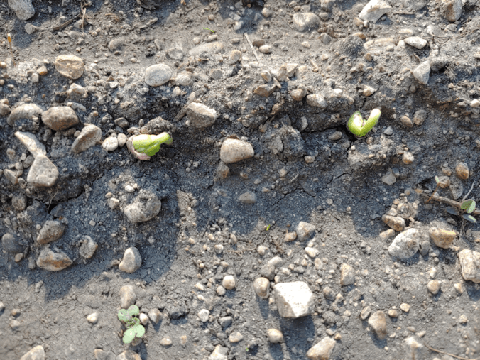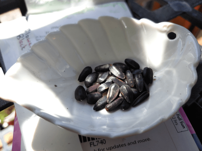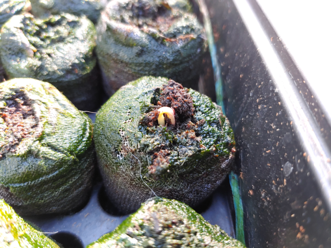 This is a Hopi Black Dye sunflower seedling! I had to check and double check to be sure. I marked the spacing to plant them with flags, which are still there, so I could use them to confirm that yes, these are in the right places and everything. Considering how long it took for just one Hopi Black Dye seedling to sprout in the tray, I am totally stunned that they are already sprouting after being direct sown, just 5 days ago! All I can think is that the seeds we tried to start indoors were just too cold to sprout, even in the warmth of the sun room. Now that I’ve started to take the tray outside, to harden off the cucamelons sharing the tray, we might get even more of them.