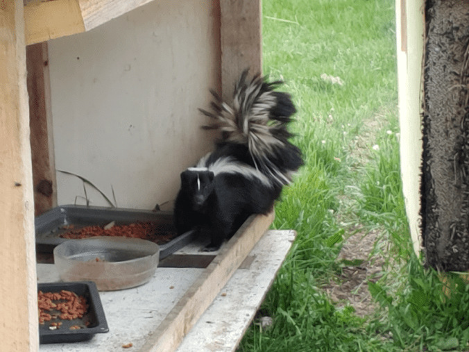 Madam Stinky came over for a snack! Later on, we saw a second one in the kibble house with this first one. I am loath to chase any critter away from food when it’s not doing any harm, but it’s really not good for them, and there is potential for harm. I think they are both hungry mamas. It’s certainly the time of year for them to have babies. When I used the hose to spray them away, the second one, which is quite a bit bigger than this one, did NOT want to leave! It kept grunting at me and trying to go back to the kibble house, until the water finally drove it away.