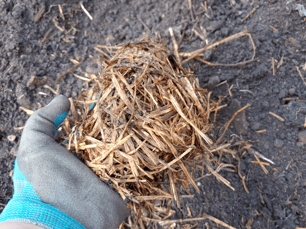I stole the grass clippings from the nearby garlic bed, replacing it with straw. I was concerned the grass clippings might smother the garlic. Later, we will replace the grass clipping mulch on the other two beds with straw as well.