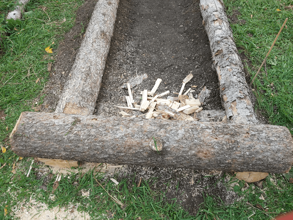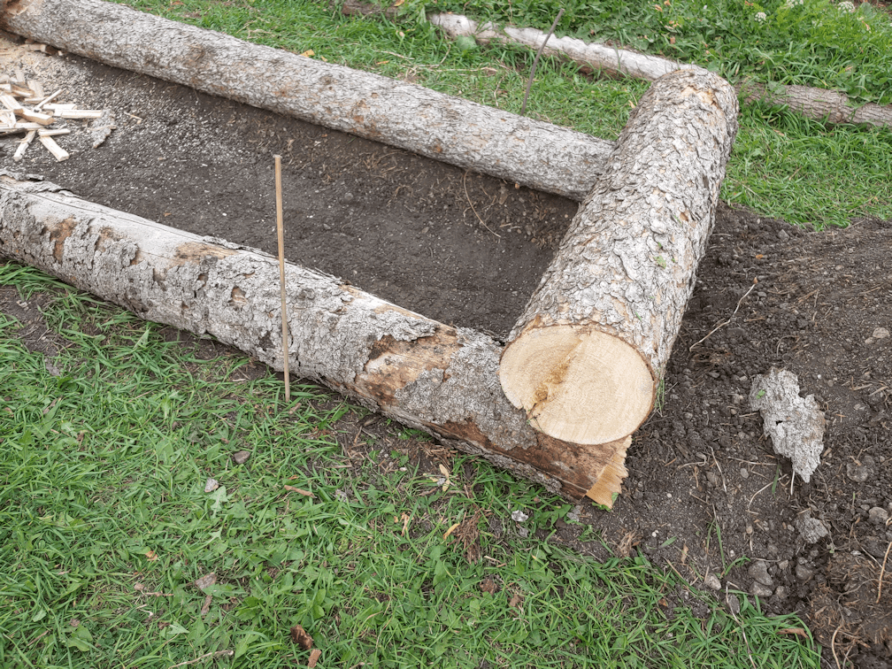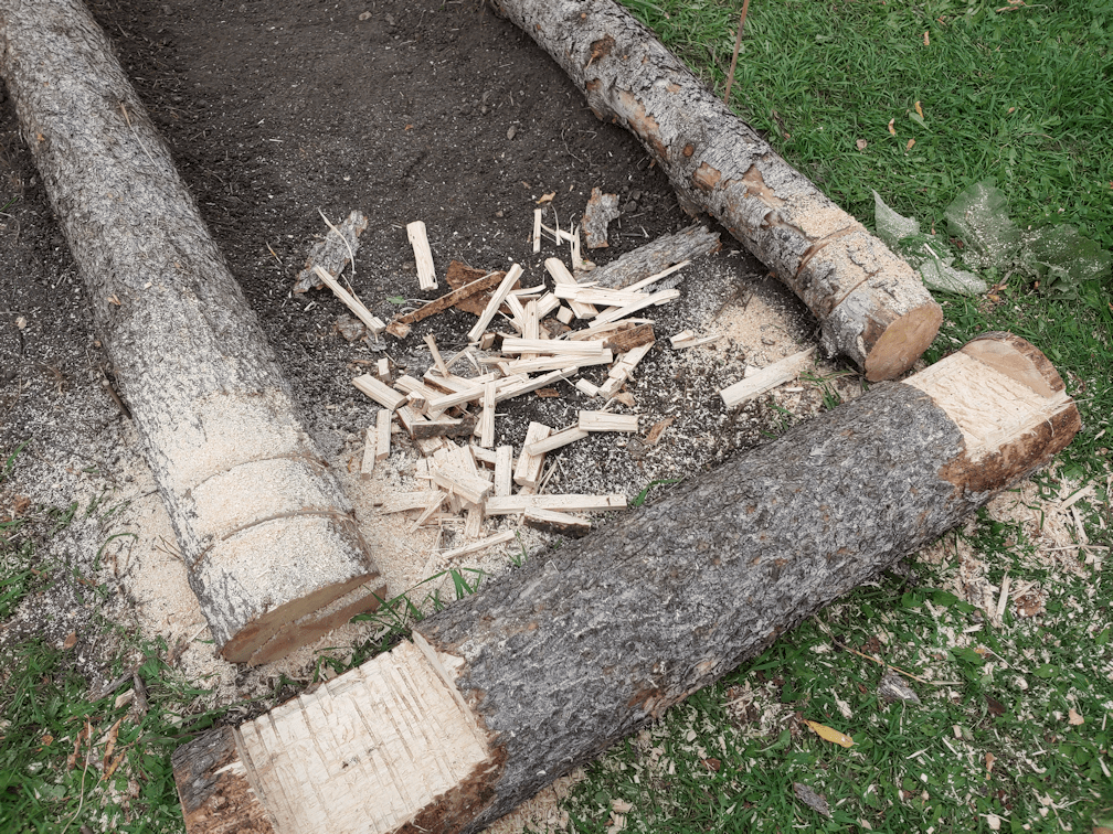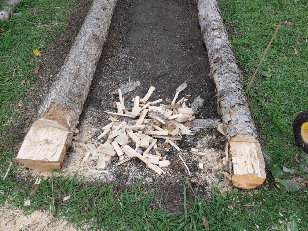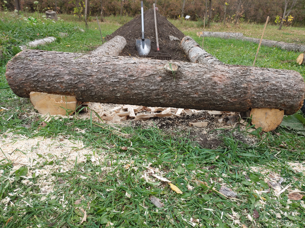 Thankfully, we have lots of bark debris. This spot used to have a pile of logs between the two spruces. There is just one long one with a weirdly shaped end left. It needs to be cut up before we can use it.
