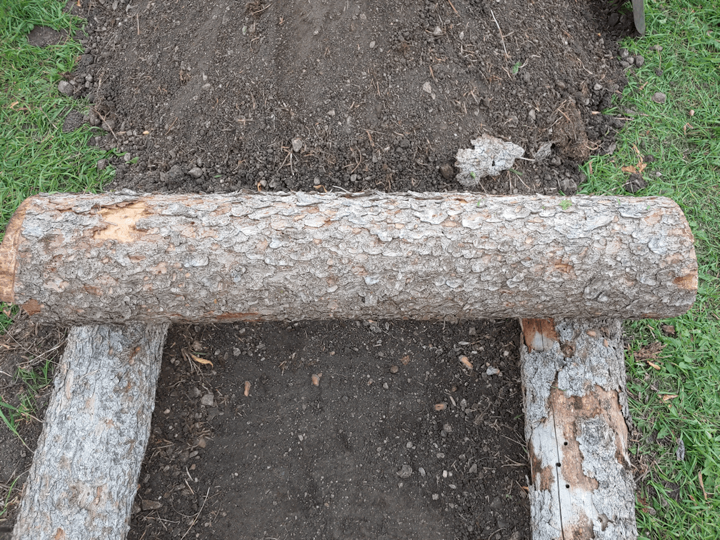 Next, a few shovels full of soil was added. This is the soil that had been dug out of this bed before the high raised bed was built. Just a very thin layer was added to fill in the gaps a bit more, and give the breakdown of the wood a bit of a boost of soil microorganisms.