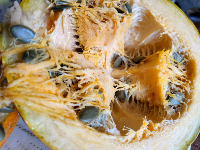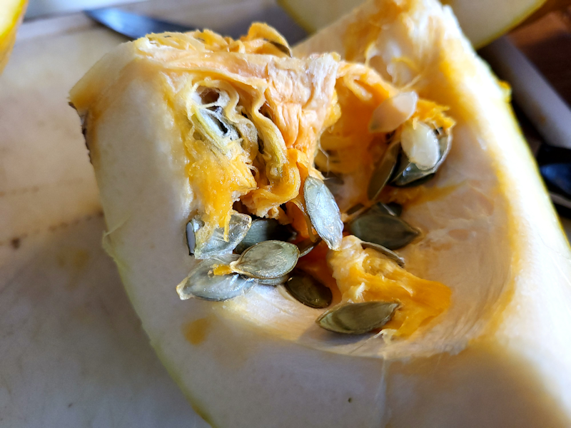 One type of hulless pumpkins (Styrian, I think. I’ve lost track!) have turned completely yellow and orange. So I decided to open up the two largest ones, first.