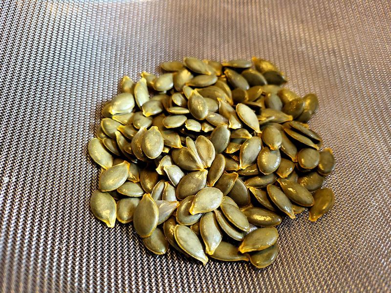 Yesterday, I decided it was time to crack open some of the hulless seed pumpkins. All the pumpkins and squash seem to have handled curing and storage pretty well. All the ones that were green or green striped have turned yellow and orange, with some of the hulless seed pumpkins turning more yellow with green, rather than green with yellow.