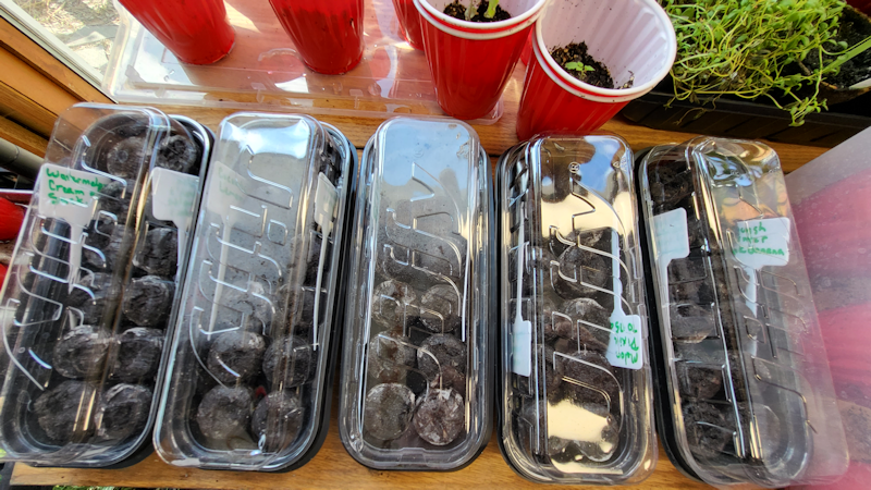 Last night, I started hydrating the seed trays with the Jiffy pellets, then headed into town this morning to pick up some more seed starting mix for the other tray.