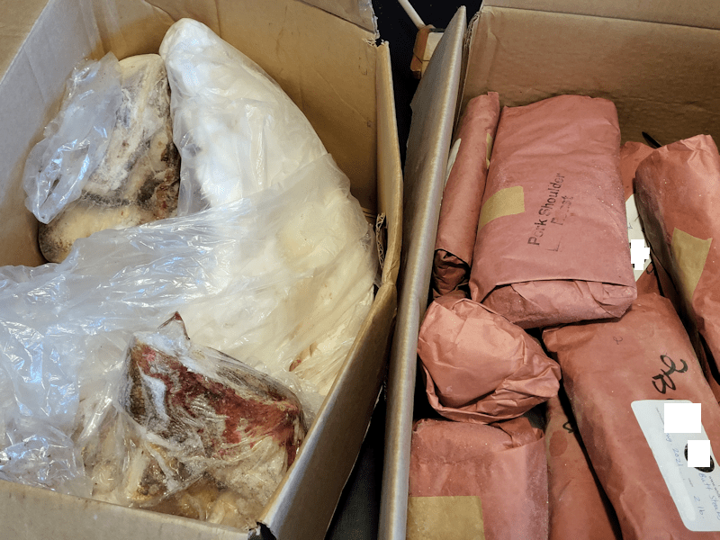 The box on the right is almost all pork, with four HUGE chickens buried under them, for $200. The box on the left is leaf lard, plus some soup bones, that they added in for free.