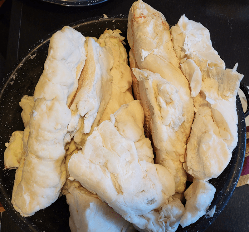 The fat has been set aside in a giant bowl to thaw out. I had to cut some of it up to fit it in so I could cover it and protect it from the cats. Thankfully, even when frozen, fat is pretty easy to cut through. Once it’s thawed a bit more, I’ll cut it into small pieces, and we’ll render it into lard, leaving behind what my mother used to call “skvarki“. I’ve spelled that phonetically, because I have no idea how it was spelled in Polish, and when I try looking up “cracklings”, I get a different word! The cracklings, with a bit of salt, make a great protein snack. Lard is a shelf stable fat. Properly rendered and stored, it can stay at room temperature for months, or as much as a year in the fridge. Even longer, if it’s frozen.