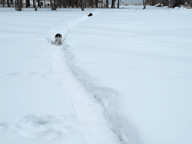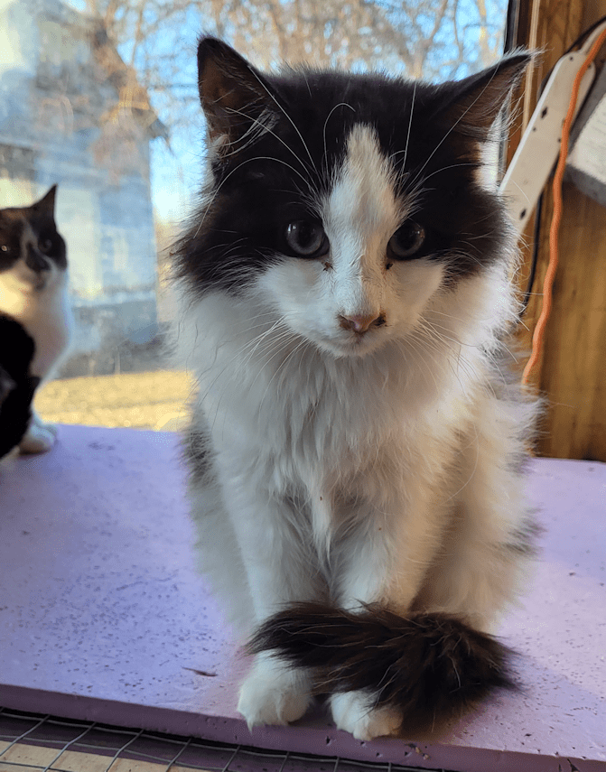 There’s a fluffy smaller kitten that looks a lot like Pom Pom I’ve been trying to get a better look at. There’s something weird about one eye, but every time I come near, the kitten runs off. Today it was in the kibble house while I was refilling the big heated water bowl right next to it, and I got the best look at its face so far. That one eye appears to be clouded. I don’t think it’s blind in that eye, but I do think it’s partially blind.