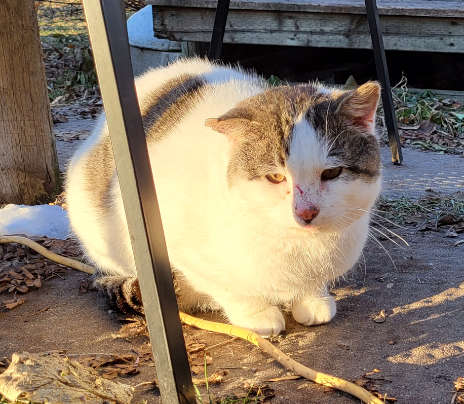Sad Face was looking sadder, with a fresh wound on his nose. He may be much less aggressive with the other cats these days, but at least one of our own males is not happy with him around and regularly growls at him. I suspect that cat is responsible, but there’s really no way of knowing. Ironically, perhaps, it’s one of the white and greys from last year’s kittens, which means Sad Face here is almost certainly his daddy!