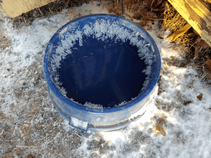 The heated water bowl was covered over even more than it was yesterday. Not just in frosted surface area, either.