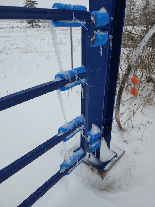 We had started out with rain, but these icicles formed on the bumpers only on one side of the gate. There’s even icicles inside the gate post, at the ends of the hinge bolts!