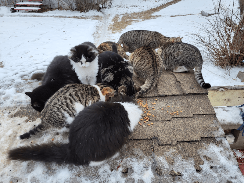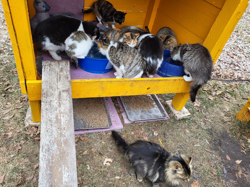By the time I finished my rounds, there was no sign of any cats outside – but as I walked past the larger windows of the cats’ house, they were packed with furry faces, watching me as I went by!