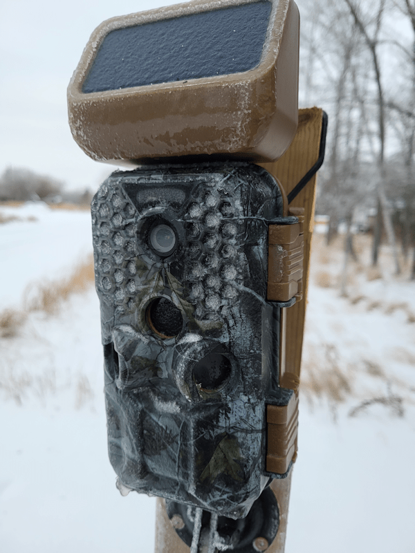 The entire front was covered with a layer of ice! The camera lens has a plastic protector in the front cover. I spent some time trying to melt it away with the heat of my fingers, then trying to scrape it off. Then I use my palms to try and melt the ice off the solar panel. There’s not much I can do for the divots in front of the infrared flash lights. At least not without some kind of tool that can get in, but from the looks of the file, enough light is getting through that the night vision still works. At least as much as possible, when the lens itself has a layer of ice over it!