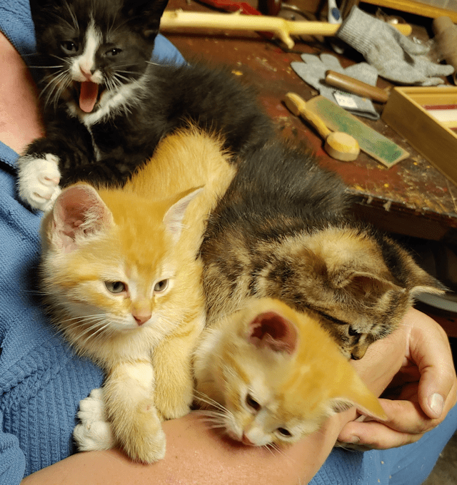 It started when I opened the door and found Leyendecker and Saffron lying on the top step. Just chillin’! They didn’t even try to run upstairs right away. Unfortunately, in my attempts to step over them, Beep Beep and the other kittens had time to run over. It took a couple of minutes to get everything under control so I could close the door, with Two Face and David also in the basement.