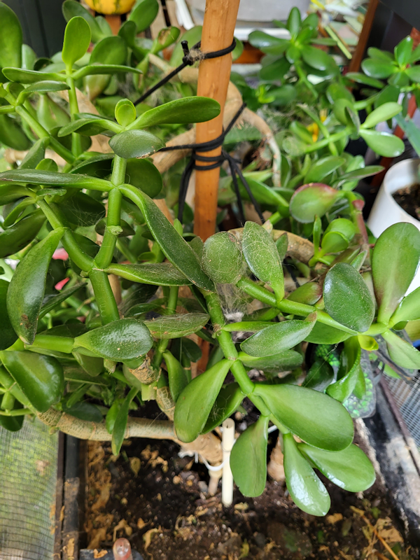 With some of the pots, you can see black “pipes”. There were four of them in one of the big pots. Those are spare parts from plastic shelves that I set up in the old basement. The ceiling is too low for the full height of the shelves, and the unused vertical pieces came in very handy to add support the jade plant when it started falling over under its own weight. Then I discovered that they worked really well to water from below. So now, I’ve split up the pipes between four pots.