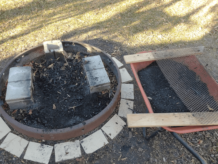I sifted the ashes, putting the bits of wood and charcoal back in the pit, while the sifted ashes went into the compost pile. I then made use of what used to be the “roof” over the old basement window that broke off at the hinges. It’ll keep the snow out if we want to use the fire pit in the winter.