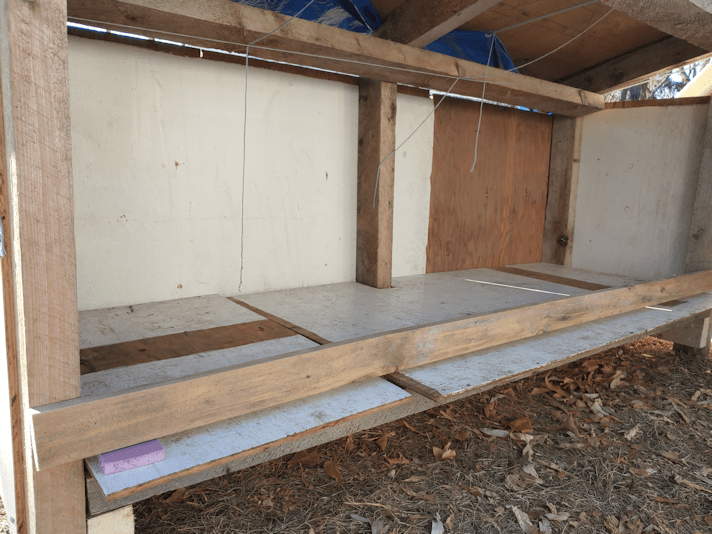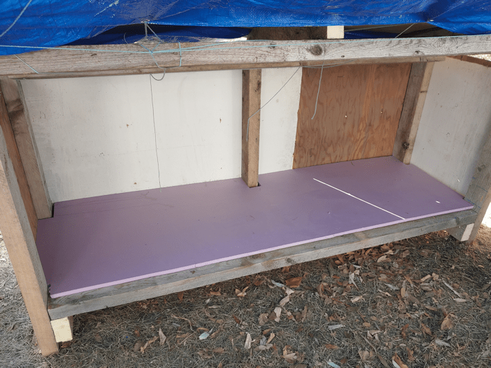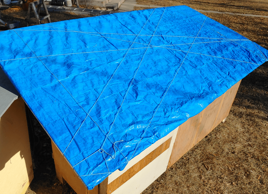 I made a new “roof” of pieces of rigid insulation, covered in plastic. With the tarp, I’d used a staple gun to try and hold it in place, but the winds just tore it all loose.