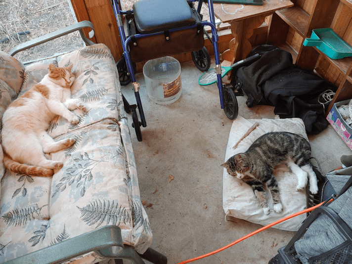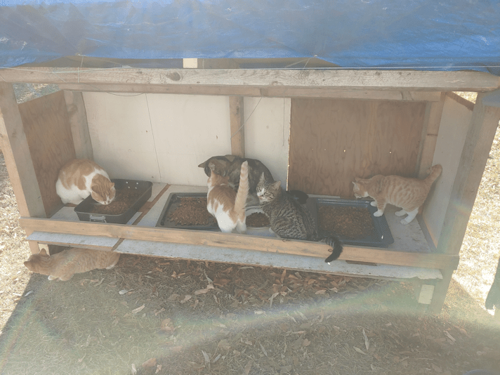 You can see tracks in the background, between the two shelters. Those led to the storage house, so we know that some cats are still sheltering under there, too.