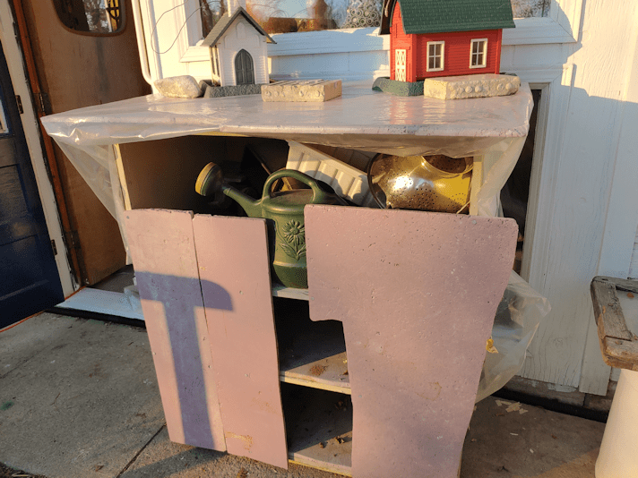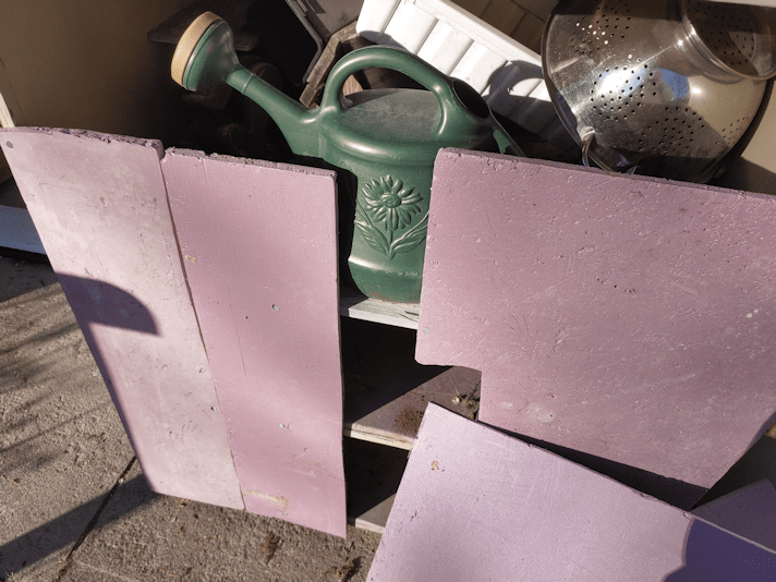 The top of the shelf has been losing layers of the … plywood? … that was on top. I’d put some larger pieces of insulation to cover it, but the wind kept blowing it around. Since the surface was so damp and coming off anyway, I removed the last of the warped bits.