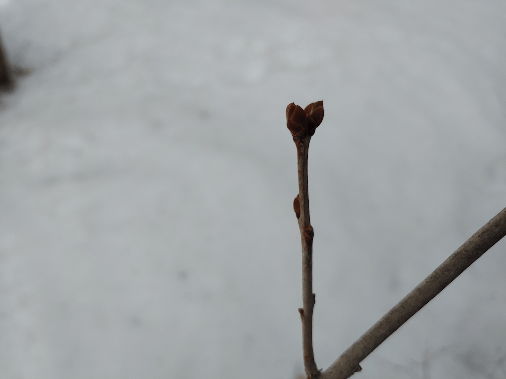 The nearby honeysuckle don’t seem to have any leaf buds yet. Those are closer to the house and in shade longer than the lilac.