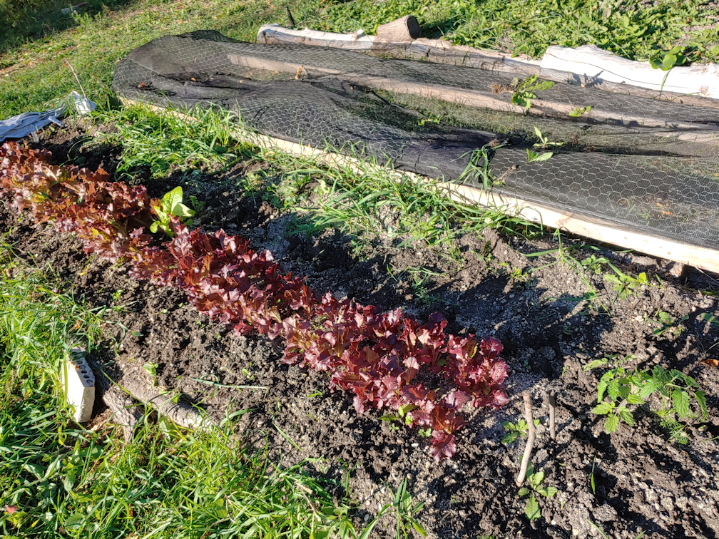 Well, that was more or less true of the spinach – what we got of it. But not so much with the lettuce. We found we just don’t eat lettuce all that much. Having them barricaded under netting didn’t help. None of us wanted lettuce enough to go through the bother of taking out pegs holding the netting to the ground (so nothing could crawl under it) to harvest leaves.