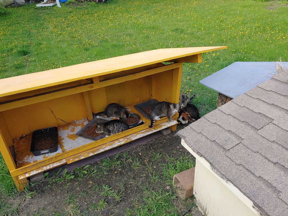 My daughter and I got completely soaked, unloading the truck! It was late enough that I did the outside cat feeding right away, while my daughter parked the truck. We didn’t have any concerns about cats going under the truck, though. They were staying well out of the rain until I was actively putting food out, and even then, it was just to dash from shelter to shelter. The bigger kittens were sleeping in big piles, one in the water bowl shelter, and others in the cat house. Poirot’s babies just had each other, and Mom, in the sun room.