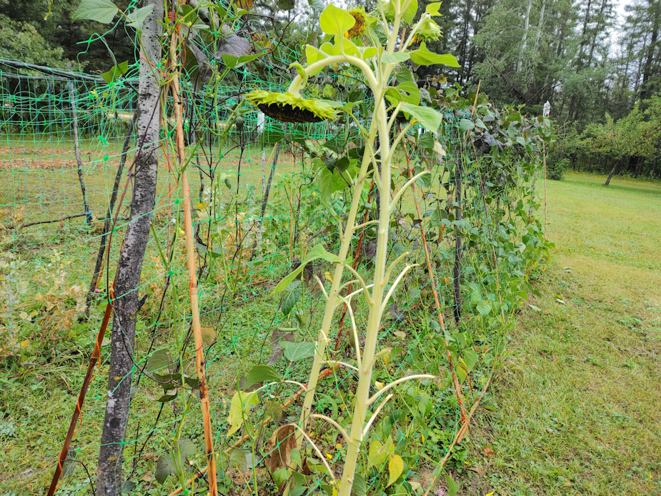 Overnight, the self-seeded sunflowers had almost all their leaves eaten. The green beans also had a lot of their leaves eaten, along the length of about half the trellis. The pods got left, though. We have stopped harvesting the beans, though we could probably still be picking the green ones. They are still blooming and producing new pods, though in much reduced quantities.