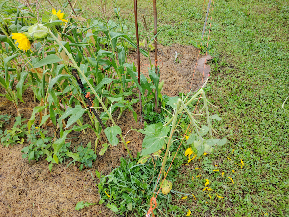 Two of the self seeded (well… bird seeded…) sunflowers by the sweet corn also got et. There is no new damage to the corn, though. It doesn’t look like the deer went into the bed. Just munched the sunflowers at the edge.