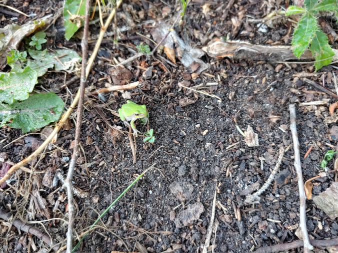 It even gave me a chance to get pretty close with my phone to take pictures, before disappearing. This is the first time I’ve seen one of the green tree frogs jumping out of these beds. Gosh, they’re pretty!