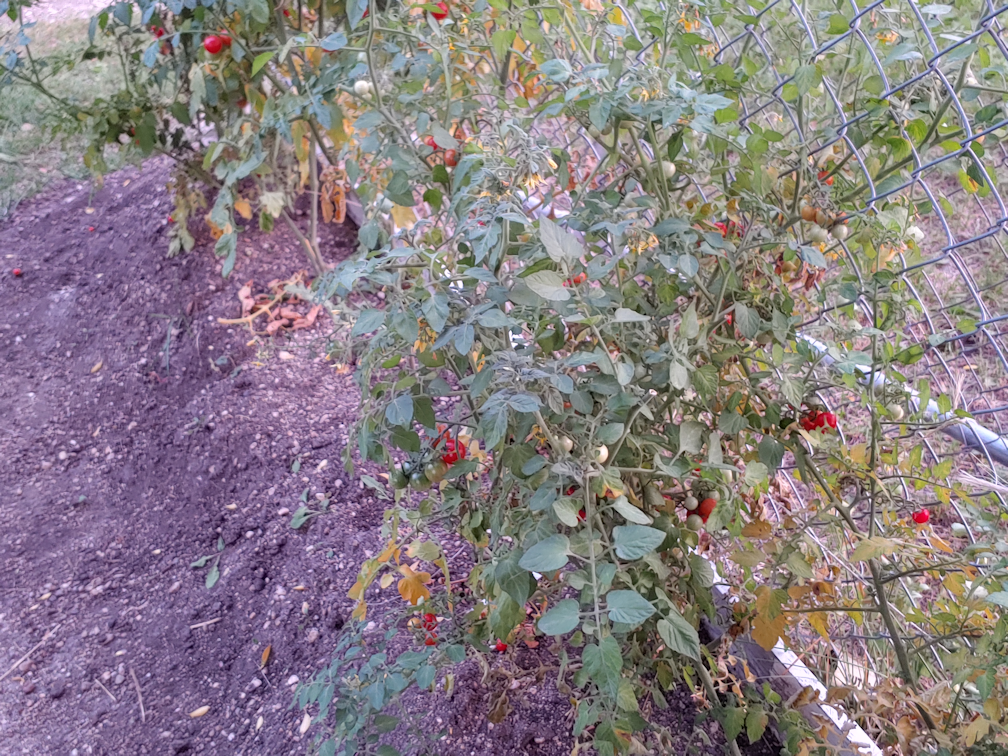 The mystery tomato plants I found among the potatoes by the chain link fence, plus the one in the wattle weave bed that showed up among the garlic, are both developing tomatoes now.