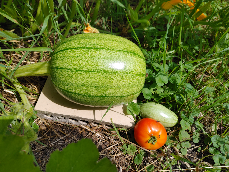 With the melons, I found the first one on the ground, its stem wound looking at me. 😄 That one had actually been growing fairly high up on the trellis, so it had fallen maybe 3 feet to get where I found it. No damage, though. Then I found two more that were ready to pick! We might almost have enough melon to start freezing some!