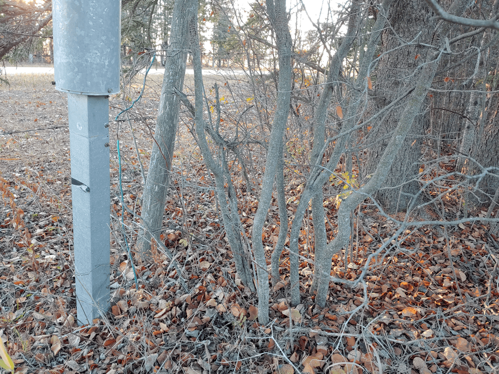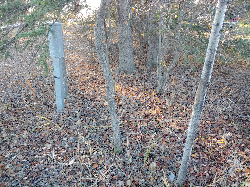 My brother remembers when the phone lines were buried, and was able to tell me why. My father had asked them to move where they were laying the wire down in the quarter section across the road, so as not to take down the large, mature spruces they would have gone right through. They agreed. Once they crossed to the home quarter, they shifted back to being closer to the north property line. There is another one of these posts near our second gate, right at the north fence line, and my brother says the line was laid from this post to the other.