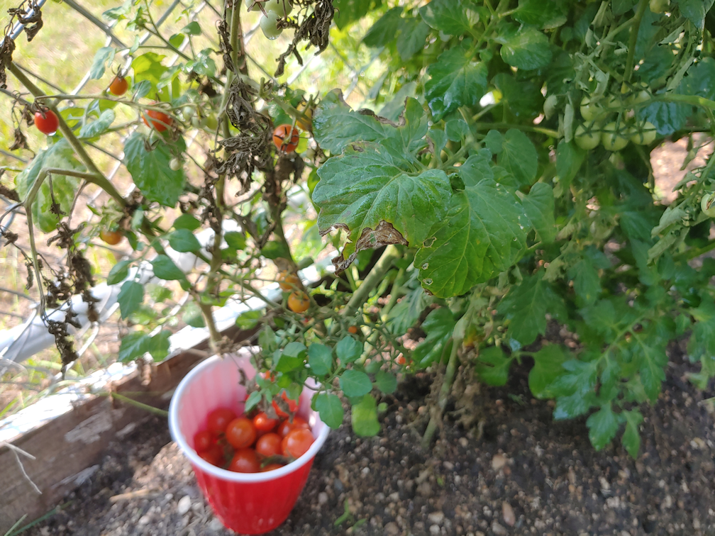 The tomatoes continue to ripen, with no signs of cold damage to them, unlike the one self-seeded tomato that’s growing near the lettuces, which is pretty much dead.