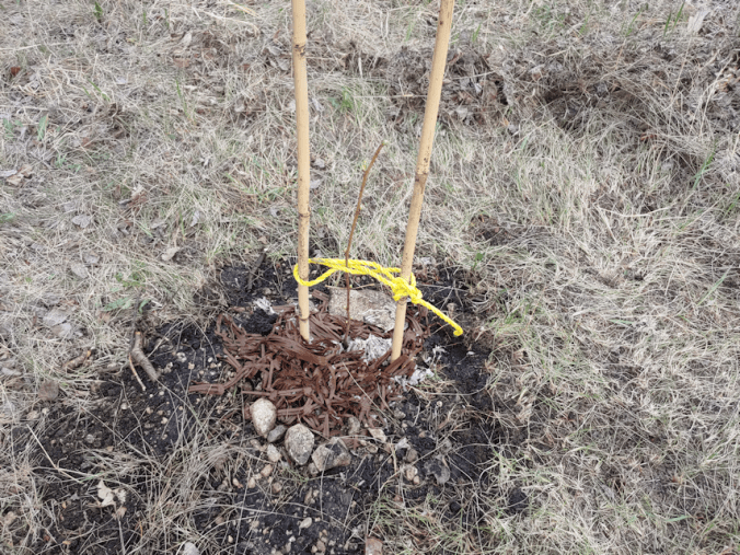 We filled half the hole with the damp peat, added more water, planted the sapling with more peat, and placed a pair of bamboo stakes beside it for supports. The soil was returned and the cardboard packing material the mulberry came in, including what was keeping the root ball damp, was placed as a mulch. We even put the bigger rocks around to help keep things in place. Then I wrapped some cord around the sapling and the supports. Hopefully, this will also make sure no deer will eat it! I also picked the yellow rope deliberately. I’ve read that using ordinary yellow rope like this, strung in a rope fence around a garden, has worked to keep deer out, even though they can easily get by it. Apparently, there’s something about the yellow rope they don’t like. I figure it’s worth a try to use it, since I happened to find some in the sun room. If not the colour, then the stakes, should act as a deterrent.