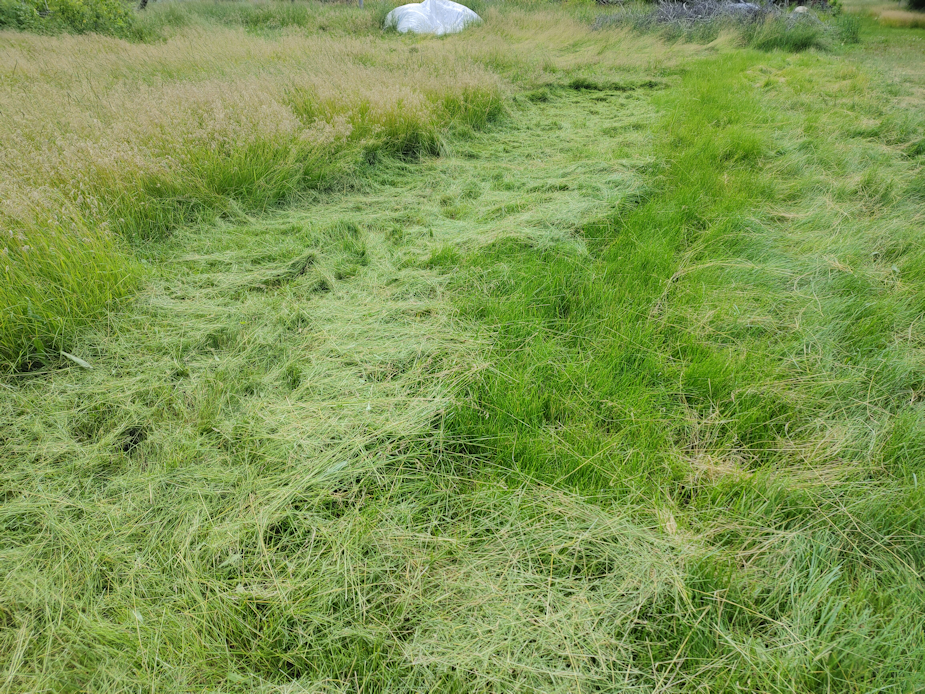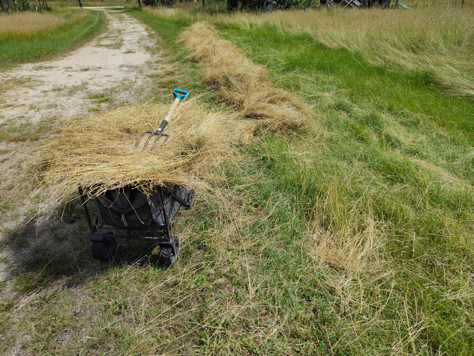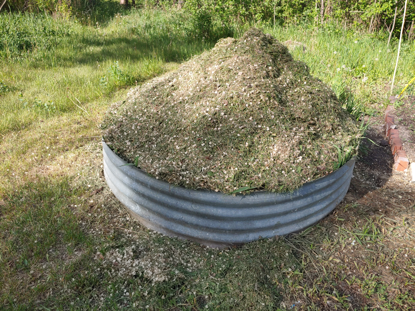 Today we hit 23C/73F with the humidex at 25C/77F, and full sun. That gave the grass clippings from yesterday’s mowing in the outer yard a chance to dry. My other daughter helped me rake it up and haul it over.