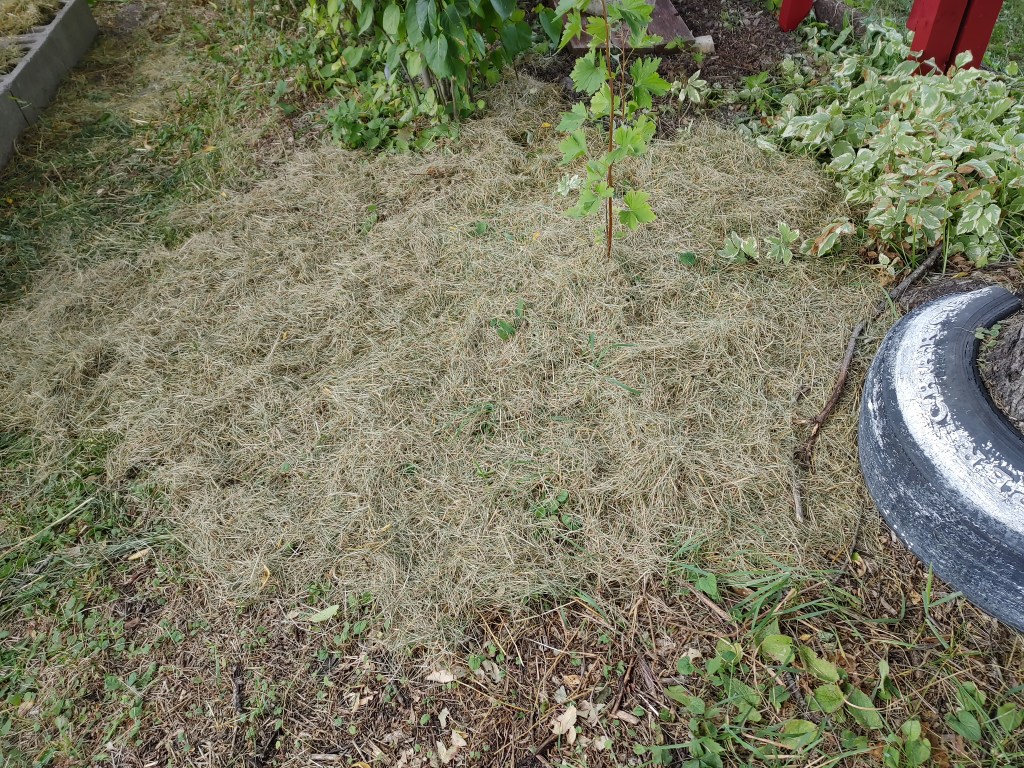 My only concern with this is all the Chinese Elm seeds in there. Piles of grass clippings get shocking hot, though, so I’m hoping that will kill off at least some of the seeds. :-/